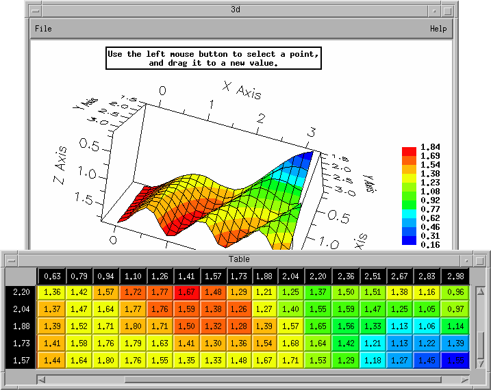 XRT/table は、2Dグラフウィジェットの XRT/graph、3Dグラフウィジェットの XRT/3d と組み合わせて使用することができます。 ひとつのウィジェットに対するアップデ-トが別のウィジェットに反映されるデモ・プログラムが製品の一部として提供されていますので、 例えば、グラフのポイントがドラッグされるとそれに応じて値が変更する表、またはテ-ブルのセル値を変更してグラフをアップデ-トさせるといったインタラクティブなアプリケ-ションも簡単に作成できます。